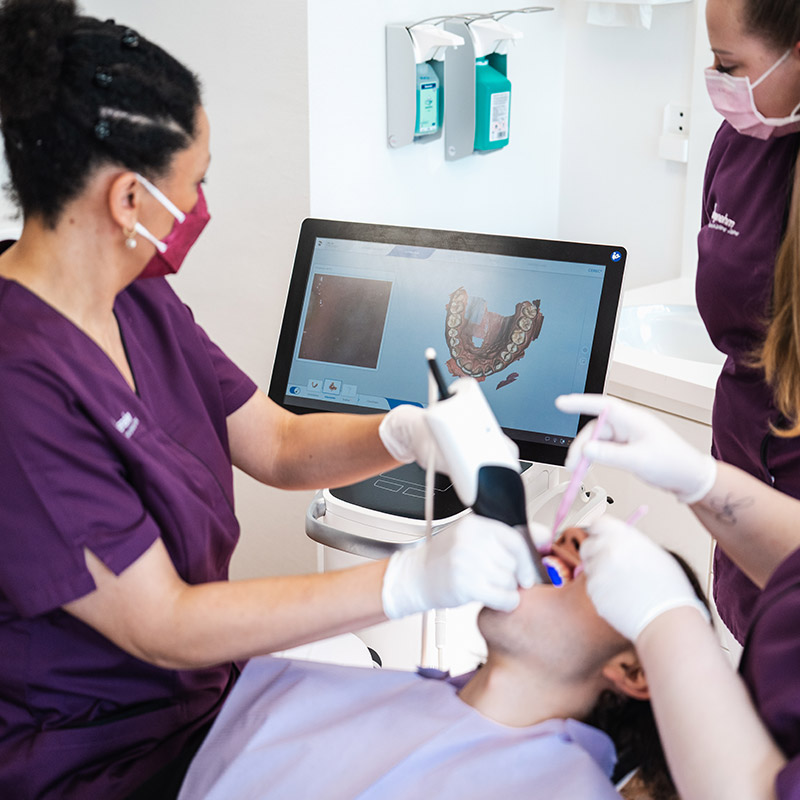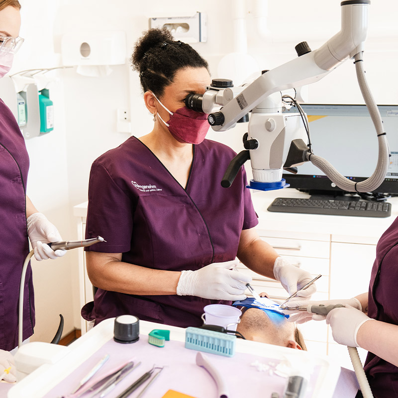 Sie dürfen bei uns das gesamte Spektrum moderner Zahnheilkunde erwarten. Ein besonderes Augenmerk legen wir dabei auf die mikroskopische Endodontie, die systematische Parodontitisbehandlung, die moderne Implantologie und die digitale, abdruckfreie Zahnersatzherstellung.